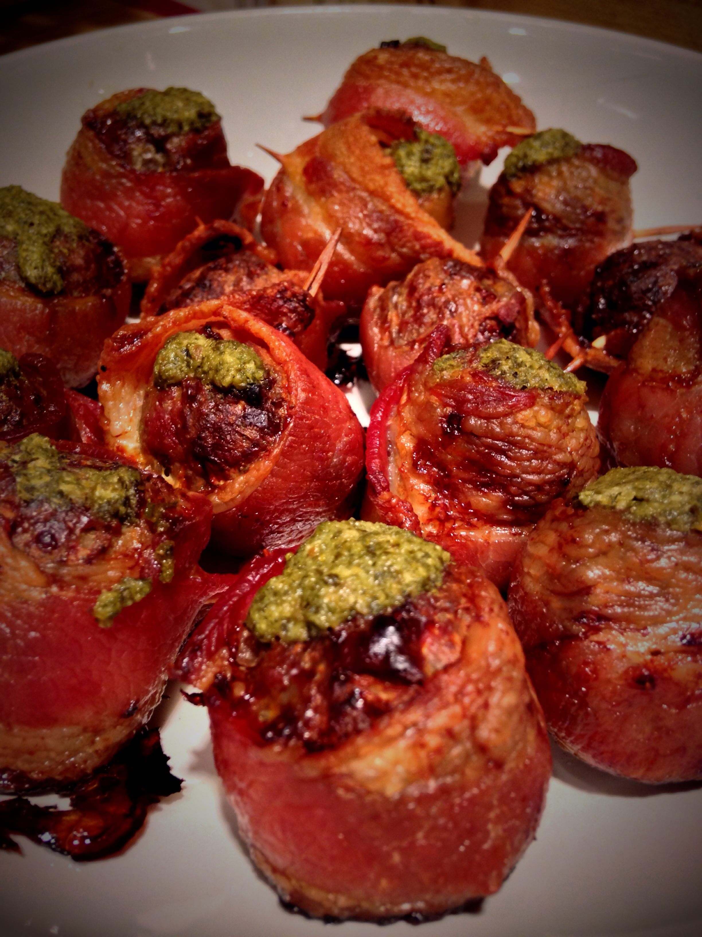 Mix all of your ingredients (except bacon), roll into balls, wrap bacon around each piece (use a toothpick to stick).