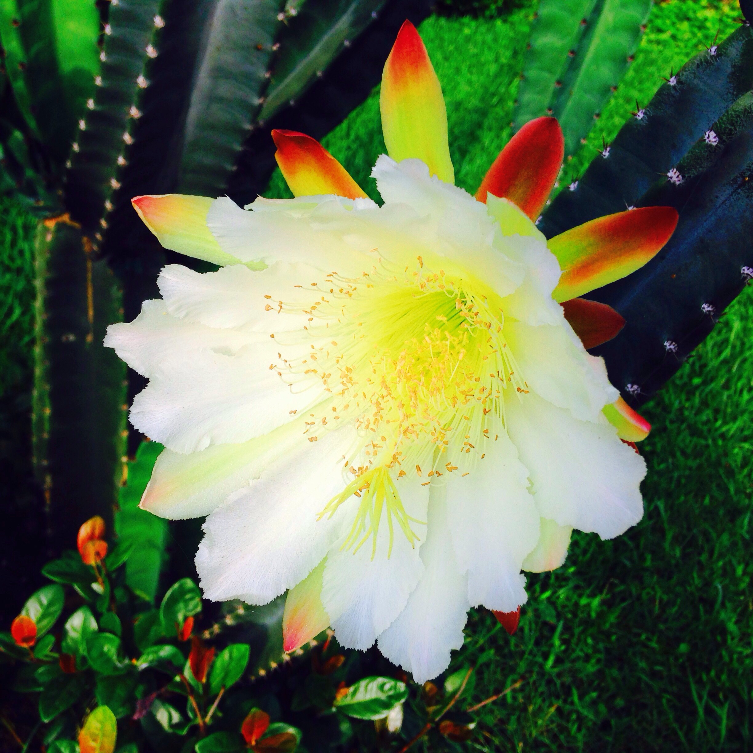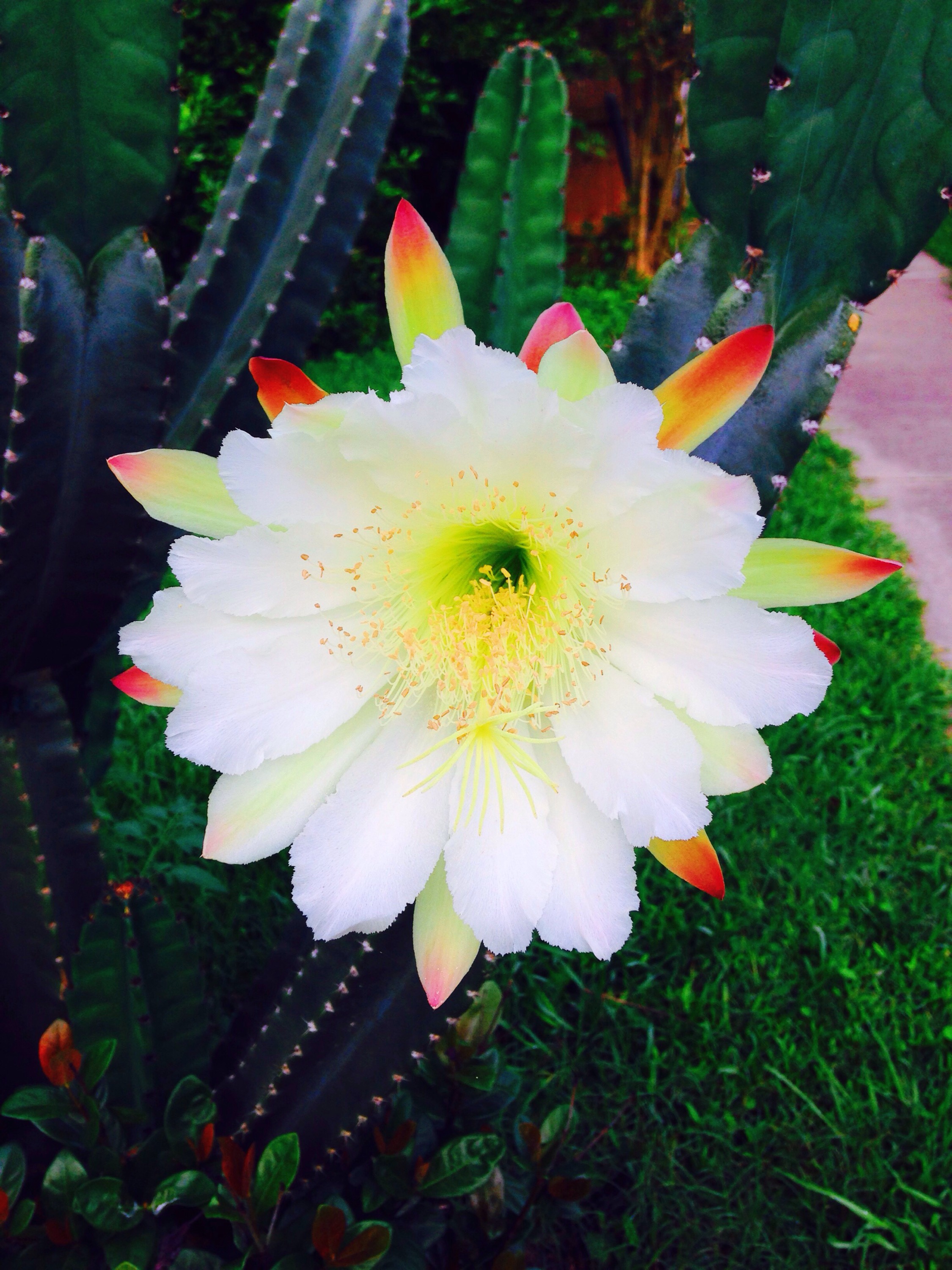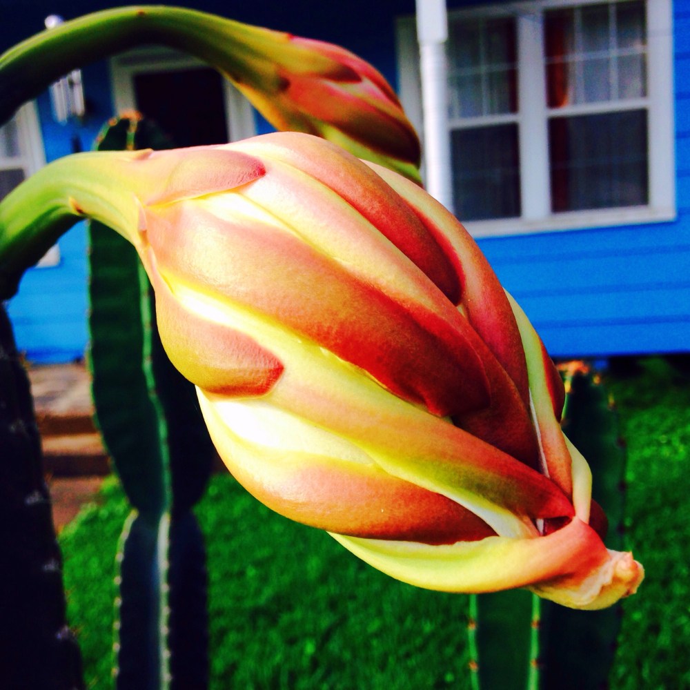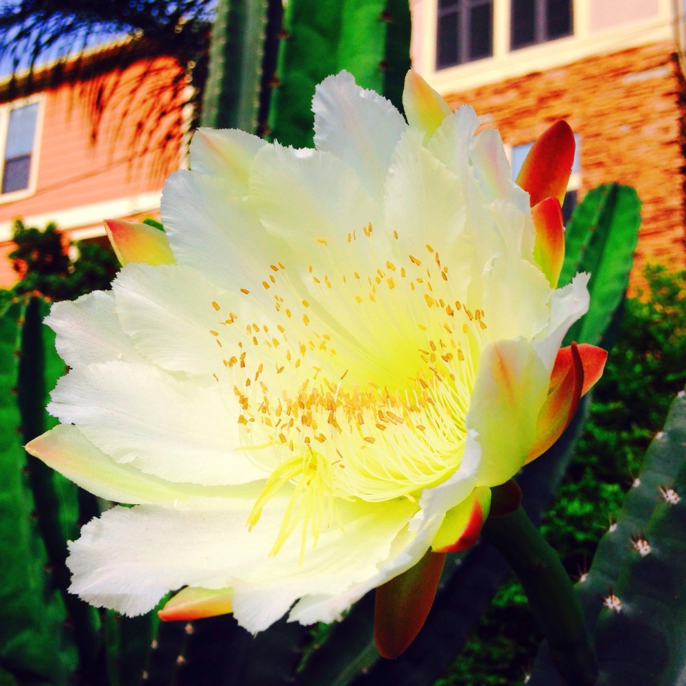 Woah! Our cactus is in full bloom. Such a beautiful sight even though it lives a short life. I’m enjoying every moment of it. I love this time of year! There are flowers everywhere, bees buzzing, the grass is greener, birds singing, butterflies soaring, frogs croaking and the sun is shining. All things coming to life. Today is a good day! Stop and smell the cacti. 😉