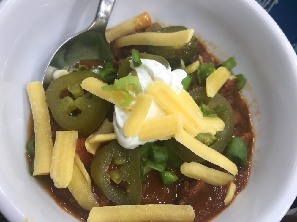 Cook the bacon until crispy, set aside. Sauté the onion and garlic in grass-fed butter, add in all vegetables and continue to cook for about 10 minutes on medium heat. Then brown the bison, add in all the spices, pour in all of the cans of tomatoes with juices, add the bacon and vegetables and cook for 30 minutes. The longer you cook the better for the flavors to meld with each other. So, if you have the time cook it for another 30 minutes or more. If not, 30 minutes will suffice. Serve with high fat sour cream, grass-fed shredded cheddar cheese, sprinkle green onions and jalapeños slices. You can also make some cauliflower rice to go with this recipe.