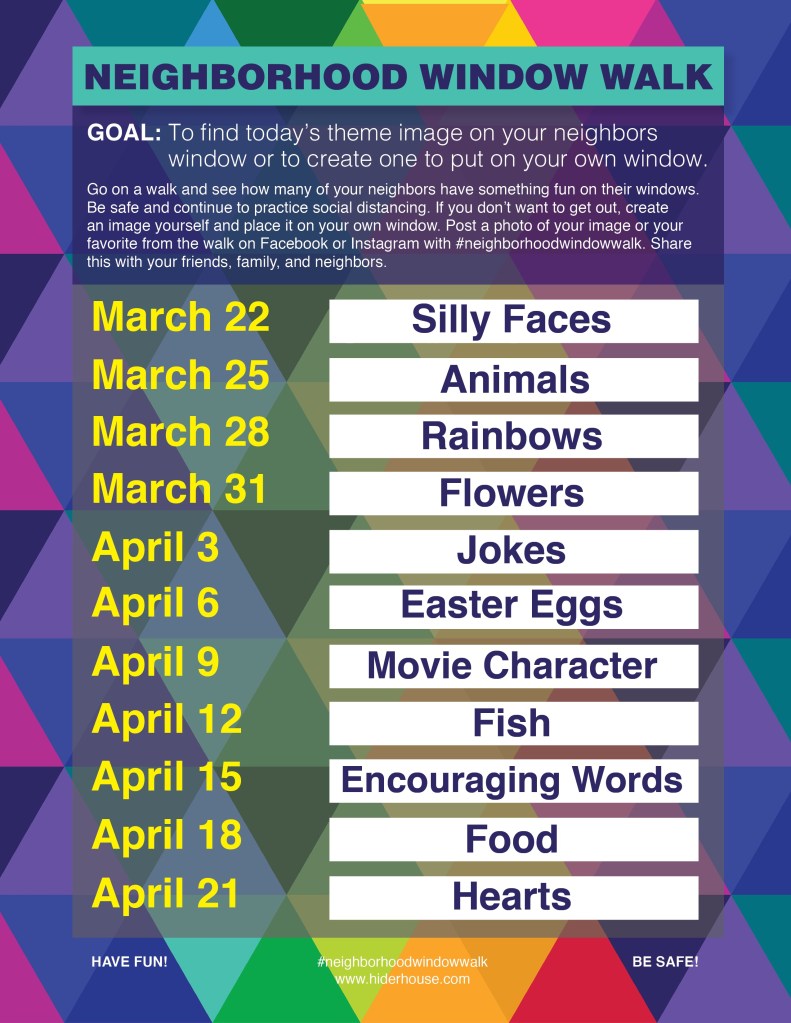 Go on a walk and see how many of your neighbors have something fun on their windows. Be safe and continue to practice social distancing. If you donβt want to get out (I’m staying in), create an image yourself and place it on your own window. You can draw/paint/color/cut out or do anything you want. Be creative! Post a photo of your image or your favorite from the walk on Facebook or Instagram with #neighborhoodwindowwalk. Share this with your friends, family, and neighbors. Have fun!!
